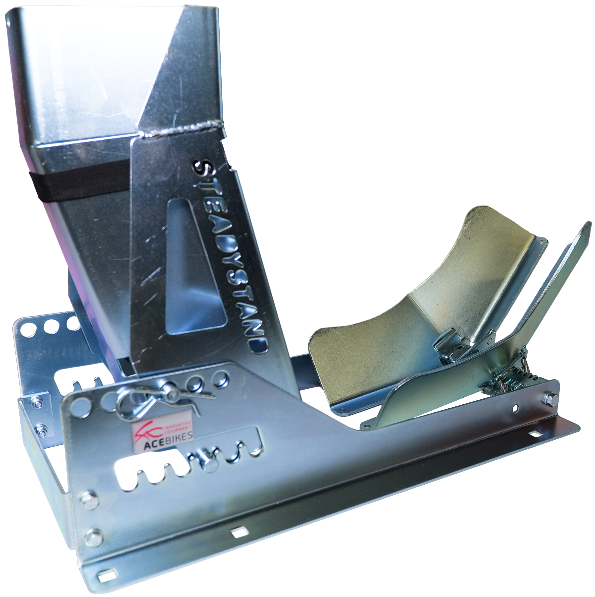 Le bloque roue basculant en acier galvanisé permet de charger votre moto et d'effectuer votre sanglage sans béquillage ni aide extérieure. Il ne peut-être utilisé qu'une fois fixé au sol. Compatible avec des roues de largeur allant de 90 à 130mm et de diamètre allant de 15 à 21 pouces.
