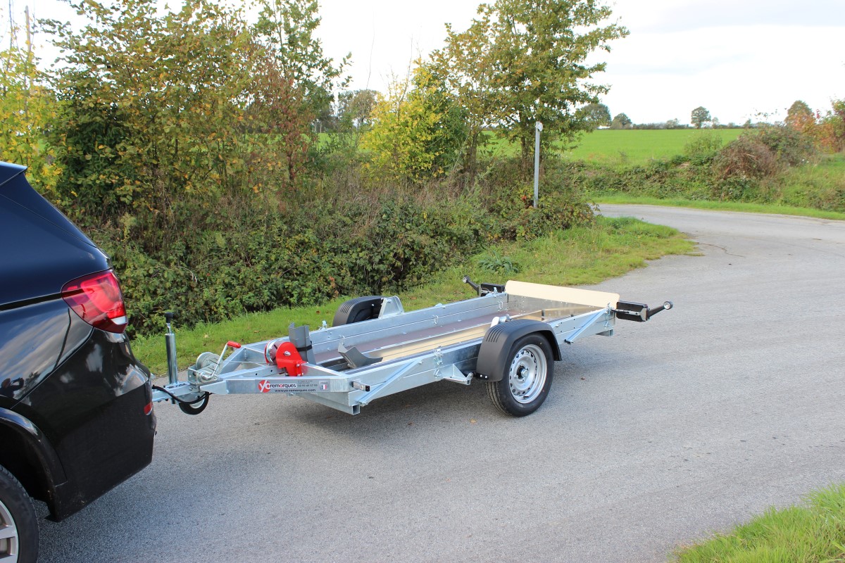 Remorque avec châssis tubulaire galvanisé à chaud. Système de descente au sol du plateau 100% à plat permettant le chargement et déchargement seul en toute sécurité.